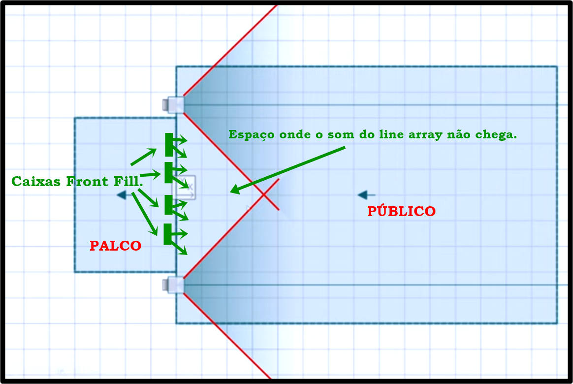 Tradução perfeita, porque usamos o front fill exatamente para preencher sonoramente a parte frontal mais próxima ao palco, onde o som do line array das laterais não consegue chegar.